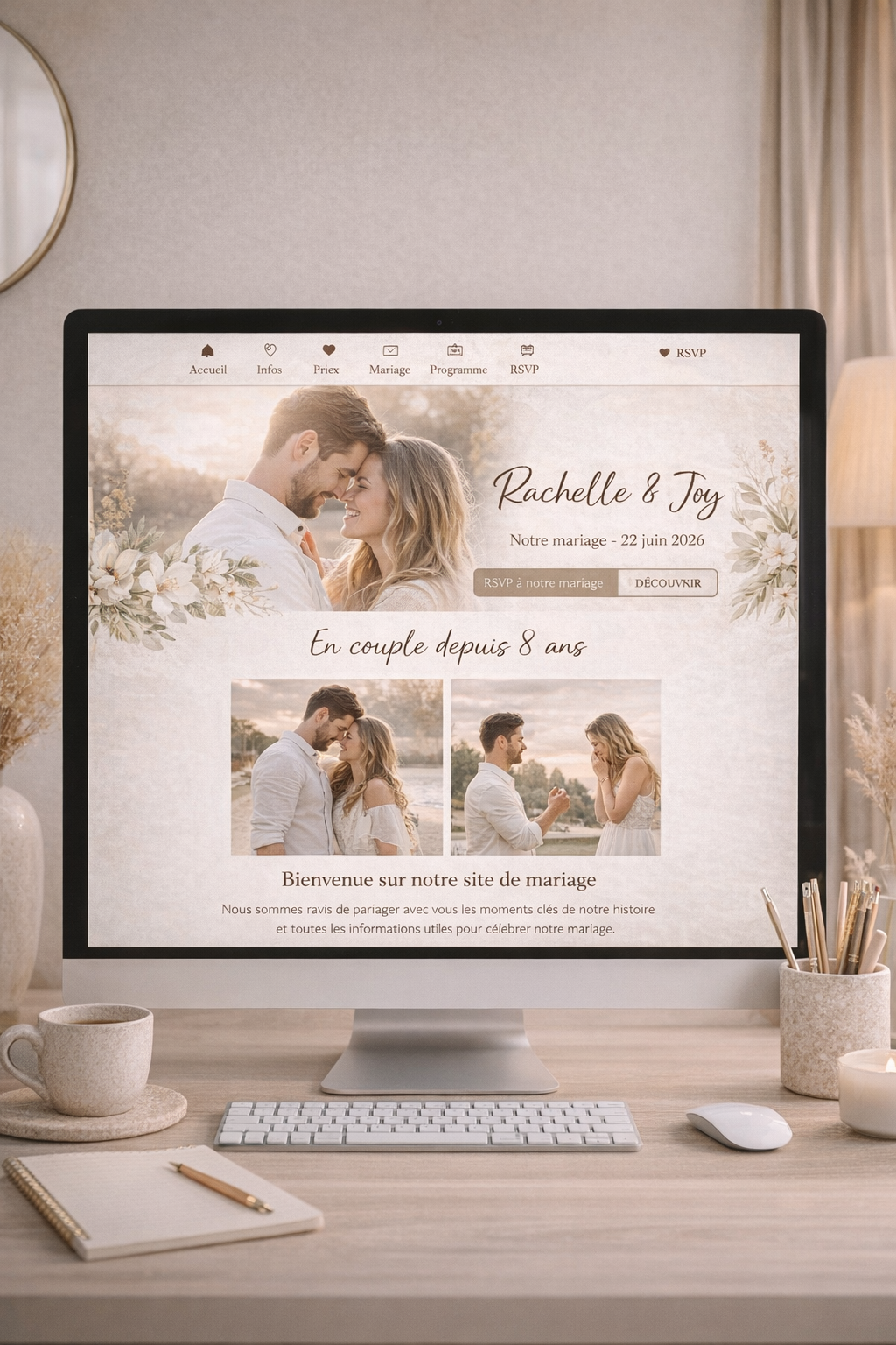 La création d'un site internet de mariage entièrement personnalisé, pensé à l'image de votre couple. Il permet d'annoncer votre événement avec élégance, partager votre parcours, et informer vos invités.